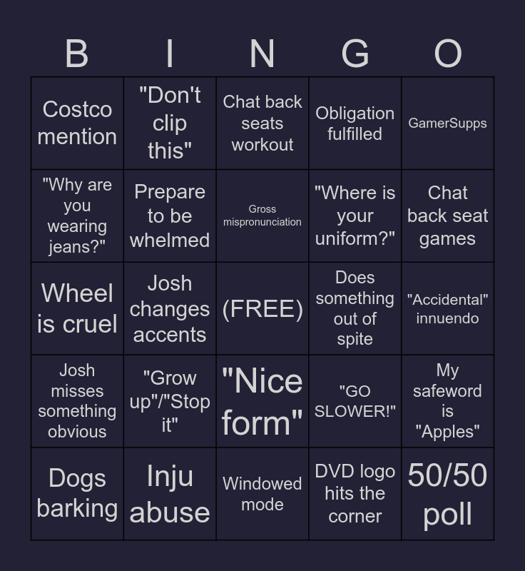 This bingo card has a free space and 39 words: Visa abuse, SACK, Josh gets utterly lost, Prepare to be whelmed, Dogs barking, "Nice form", Gross mispronunciation, Wearing shoes indoors, GamerSupps, Josh misses something obvious, Josh changes accents, Obligation fulfilled, 50/50 poll, "Accidental" innuendo, Does something out of spite, "Grow up"/"Stop it", Josh discovers a cheese strat, Costco mention, "Not sponsored, but I should be", "GO SLOWER!", "Why are you wearing jeans?", Windowed mode, "Where is your uniform?", Chat back seat games, "Nice" 69, Game design tangent, Morality tangent, Real life advice, Henry Cavill, "Don't clip this", Stolen joke from chat, "I will not use the wiki, but I will use chat", Chat back seats workout, Inju abuse, DVD logo hits the corner, "What's the treadmill?", My safeword is "Apples", Wheel is cruel and "Press ups?!".