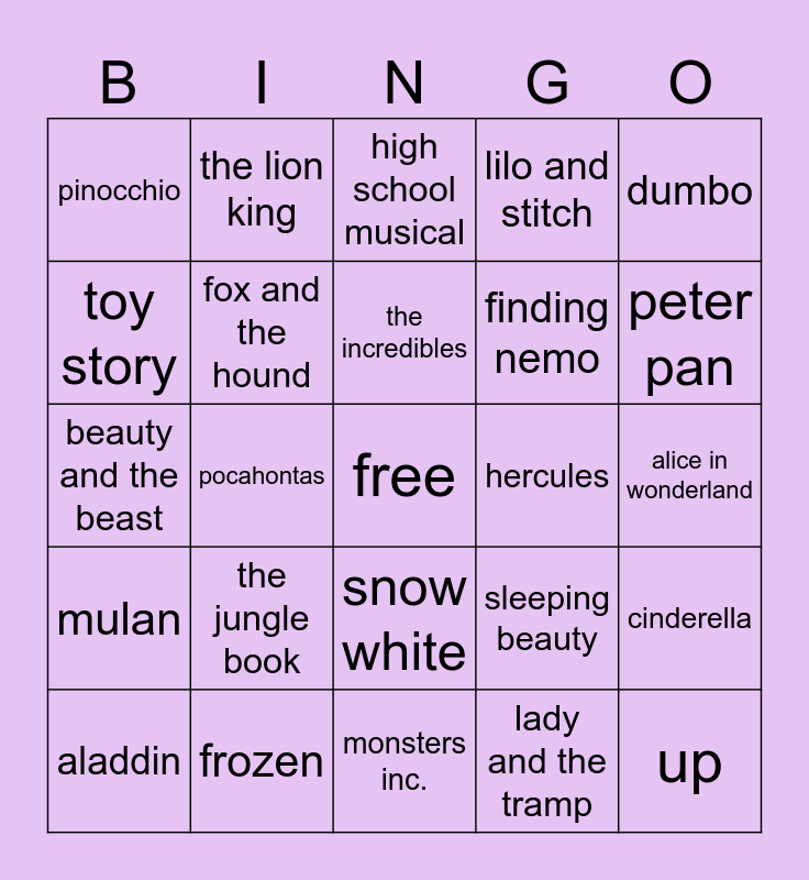This bingo card has a free space and 24 words: aladdin, the jungle book, the incredibles, lady and the tramp, dumbo, pinocchio, the lion king, high school musical, hercules, alice in wonderland, beauty and the beast, fox and the hound, sleeping beauty, cinderella, toy story, frozen, monsters inc., lilo and stitch, peter pan, mulan, pocahontas, snow white, finding nemo and up.