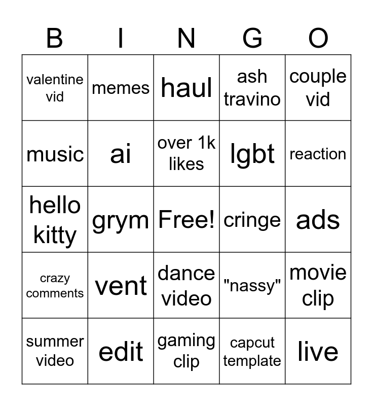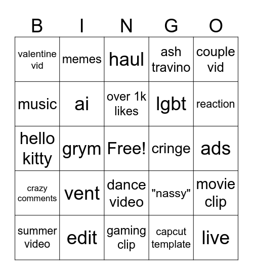 This bingo card has a free space and 24 words: vent, edit, over 1k likes, summer video, couple vid, valentine vid, music, memes, cringe, dance video, lgbt, hello kitty, "nassy", movie clip, ai, capcut template, ads, haul, reaction, grym, live, crazy comments, ash travino and gaming clip.