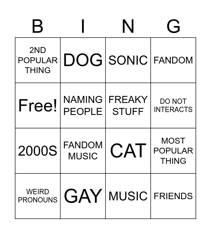 This bingo card has 16 words: GAY, MOST POPULAR THING, SONIC, 2ND POPULAR THING, 2000S, DOG, CAT, MUSIC, Free!, NAMING PEOPLE, WEIRD PRONOUNS, FANDOM, FANDOM MUSIC, DO NOT INTERACTS, FREAKY STUFF and FRIENDS.