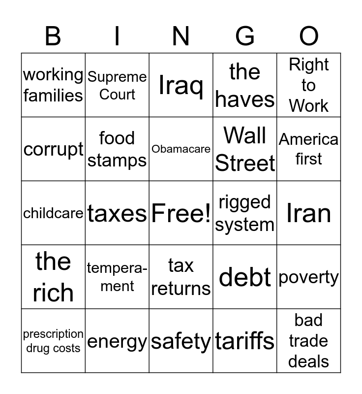 This bingo card has a free space and 24 words: tempera- ment, energy, Obamacare, prescription drug costs, Right to Work, working families, corrupt, Supreme Court, rigged system, tax returns, Wall Street, childcare, debt, poverty, food stamps, tariffs, Iran, Iraq, America first, taxes, bad trade deals, the rich, the haves and safety.