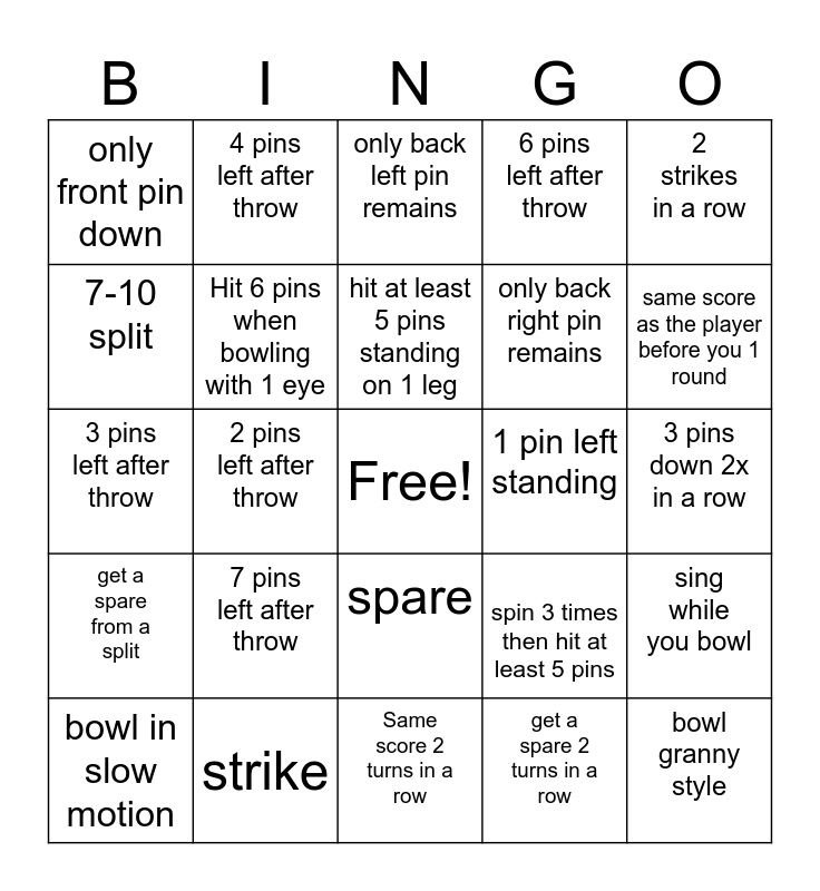 This bingo card has a free space and 24 words: 7 pins left after throw, strike, hit at least 5 pins standing on 1 leg, bowl in slow motion, 2 strikes in a row, only front pin down, 7-10 split, 4 pins left after throw, 1 pin left standing, spare, only back right pin remains, 3 pins left after throw, spin 3 times then hit at least 5 pins, sing while you bowl, Hit 6 pins when bowling with 1 eye, get a spare 2 turns in a row, 3 pins down 2x in a row, only back left pin remains, same score as the player before you 1 round, 2 pins left after throw, bowl granny style, get a spare from a split, 6 pins left after throw and Same score 2 turns in a row.