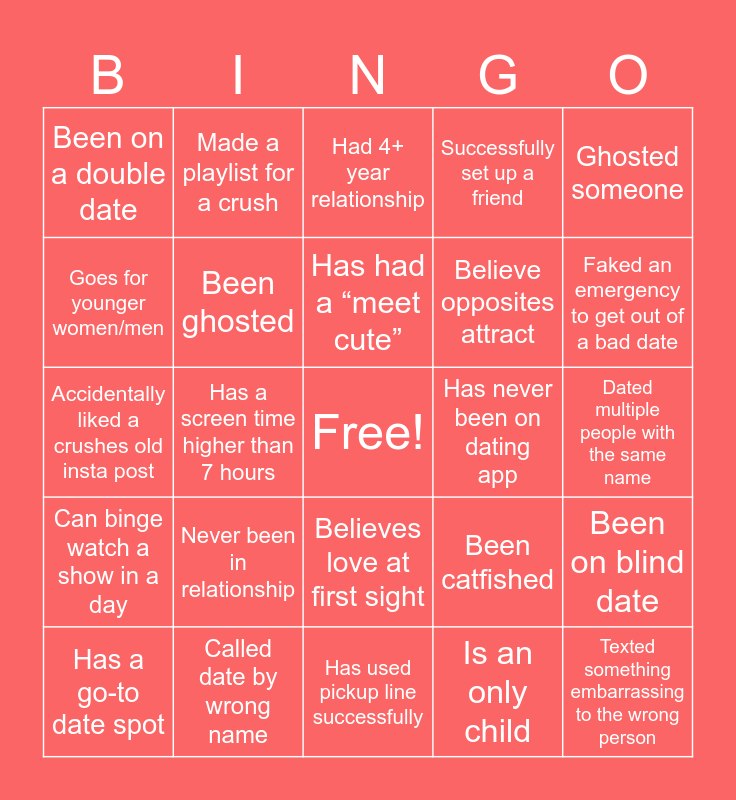 This bingo card has a free space and 24 words: Never been in relationship, Called date by wrong name, Has had a “meet cute”, Has a go-to date spot, Ghosted someone, Been on a double date, Goes for younger women/men, Made a playlist for a crush, Has never been on dating app, Believes love at first sight, Believe opposites attract, Accidentally liked a crushes old insta post, Been catfished, Been on blind date, Been ghosted, Is an only child, Dated multiple people with the same name, Had 4+ year relationship, Faked an emergency to get out of a bad date, Has a screen time higher than 7 hours, Texted something embarrassing to the wrong person, Can binge watch a show in a day, Successfully set up a friend and Has used pickup line successfully.
