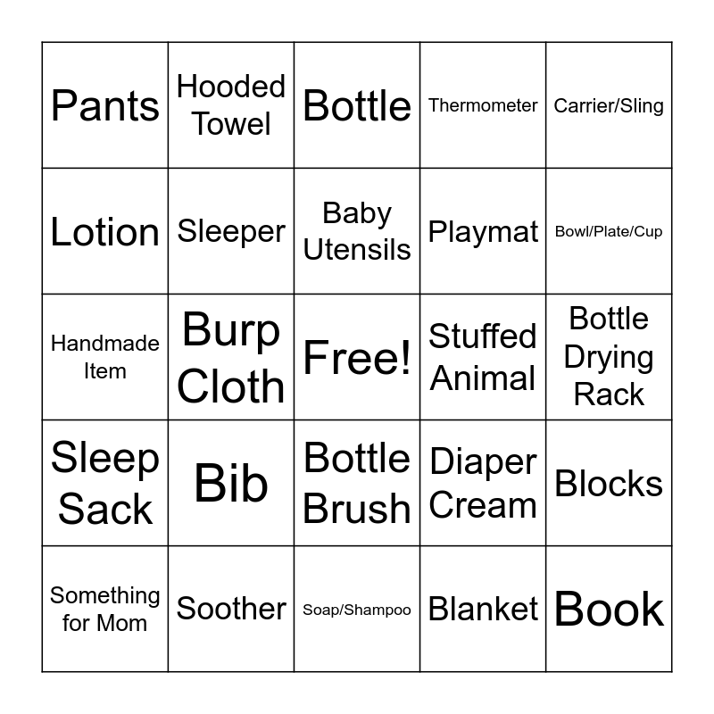 This bingo card has a free space and 42 words: Baby Monitor, Baby Utensils, Bath Toys, Bib, Blanket, Blocks, Book, Booties, Bottle, Bottle Brush, Bottle Drying Rack, Bowl/Plate/Cup, Burp Cloth, Carrier/Sling, Crinkle Toy, Diaper Cream, Grooming Kit, Handmade Item, Hat, Hooded Towel, Lotion, Memory Keepsake, Onesie, Pants, Personalized Item, Picture Frame, Playmat, Rattle, Rubber Ducky, Safety Gear, Shirt, Sleep Sack, Sleeper, Soap/Shampoo, Socks, Something for Mom, Soother, Stuffed Animal, Swaddle, Teethers, Thermometer and Washcloths.