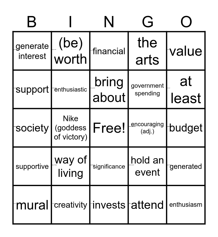 This bingo card has 19 images, a free space and 24 words: way of living, creativity, bring about, mural, value, generate interest, support, (be) worth, encouraging (adj.), significance, government spending, society, hold an event, generated, enthusiastic, attend, budget, financial, at least, Nike (goddess of victory), enthusiasm, supportive, the arts and invests.