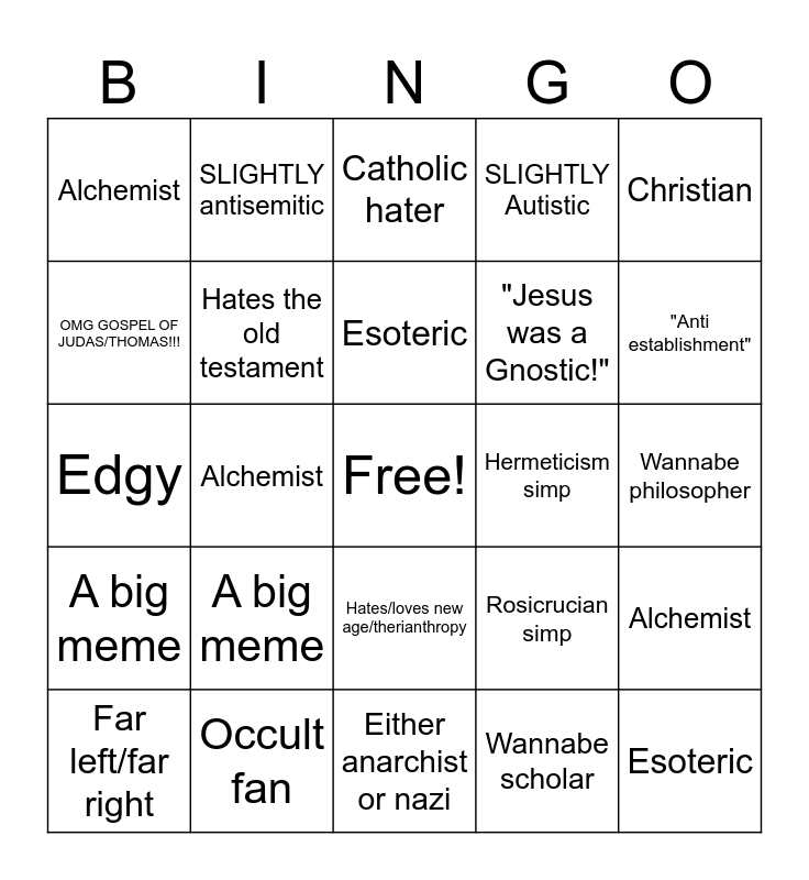 This bingo card has a free space and 24 words: A big meme, Occult fan, Esoteric, Far left/far right, Christian, Alchemist, OMG GOSPEL OF JUDAS/THOMAS!!!, SLIGHTLY antisemitic, Hermeticism simp, Hates/loves new age/therianthropy, "Jesus was a Gnostic!", Edgy, Rosicrucian simp, Alchemist, Hates the old testament, Wannabe scholar, Wannabe philosopher, Catholic hater, "Anti establishment", Alchemist, Esoteric, A big meme, SLIGHTLY Autistic and Either anarchist or nazi.