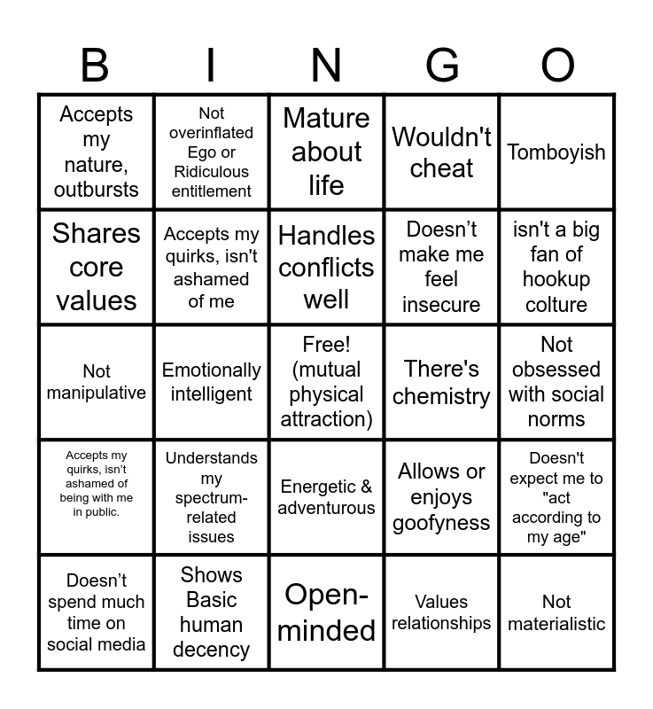 This bingo card has a free space and 24 words: Understands my spectrum-related issues, Shows Basic human decency, Handles conflicts well, Doesn’t spend much time on social media, Tomboyish, Accepts my nature, outbursts, Shares core values, Not overinflated Ego or Ridiculous entitlement, There's chemistry, Energetic & adventurous, Doesn’t make me feel insecure, Not manipulative, Allows or enjoys goofyness, Doesn't expect me to "act according to my age", Accepts my quirks, isn't ashamed of me, Values relationships, Not obsessed with social norms, Mature about life, isn't a big fan of hookup colture, Emotionally intelligent, Not materialistic, Accepts my quirks, isn’t ashamed of being with me in public., Wouldn't cheat and Open-minded.