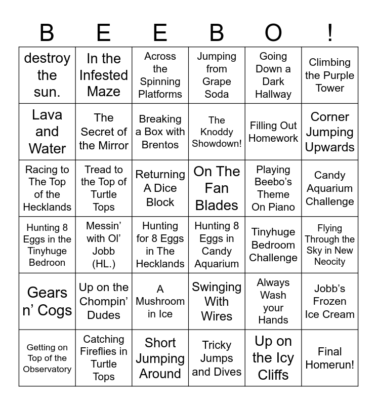 This bingo card has 60 words: In the Water Chunks, Hunting 8 Eggs in Candy Aquarium, Making the Longest Jumps Possible, On The Fan Blades, Flying Through the Sky in New Neocity, Racing to The Top of New Neocity, Lava and Water, The Hecklord Showdown!, Breaking a Box with Brentos, Hermit Gloobes Problem, Jumping from Grape Soda, Messin’ with Ol’ Jobb (C.A.), Climbing the Purple Tower, Getting on Top of the Observatory, Through the Flames and the Fire, destroy the sun., Racing to The Top of the Hecklands, Going Down a Dark Hallway, You can Jump!, The Secret of the Mirror, Tread to the Top of Turtle Tops, Across the Spinning Platforms, Hunting for 8 Eggs in The Hecklands, Messin’ with Ol’ Jobb (HL.), Beebo Wings into the Sky, Catching Fireflies in Turtle Tops, Always Wash your Hands, Hunting 8 Eggs Underwater, The Knoddy Showdown!, Tricky Jumps and Dives, The Guards Go For a Dip, Scoring Radical Points, Floating with Flowers, A Hungry Black Hole, In the Infested Maze, Up on the Chompin’ Dudes, Above the Wall, Corner Jumping Upwards, Short Jumping Around, Filling Out Homework, Setting Up The Computer, Playing Beebo’s Theme On Piano, Returning A Dice Block, Up On the Shelf, Hunting 8 Eggs in the Tinyhuge Bedroon, Swinging With Wires, Turtle Tops Challenge, Knoddy’s Resort Challenge, The Hecklands Challenge, Candy Aquarium Challenge, Tinyhuge Bedroom Challenge, New Neocity Challenge, Final Homerun!, A Mushroom in Ice, Jobb’s Frozen Ice Cream, Up on the Icy Cliffs, Top of the Factory, Buzz Off, Big Bees!, Gears n’ Cogs and Collecting Honey.