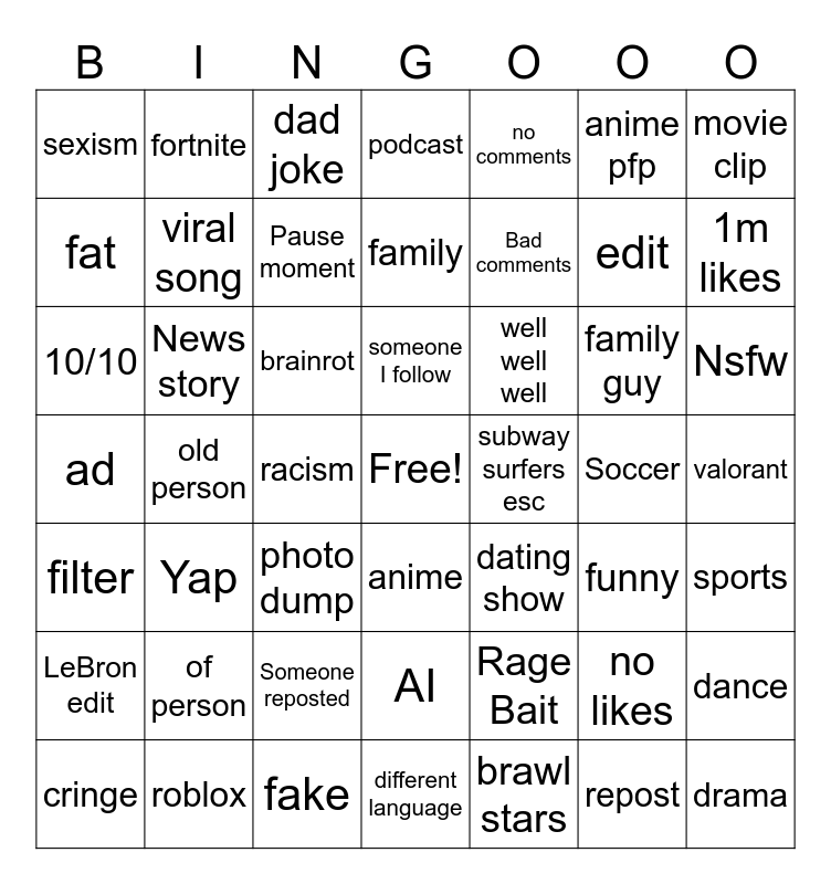 This bingo card has a free space and 48 words: Rage Bait, edit, different language, old person, brainrot, valorant, fortnite, roblox, anime pfp, anime, movie clip, podcast, family guy, well well well, LeBron edit, Soccer, fat, 1m likes, no likes, no comments, Bad comments, racism, sexism, viral song, dance, Pause moment, Nsfw, cringe, someone I follow, News story, repost, subway surfers esc, sports, of person, ad, dating show, funny, 10/10, photo dump, Someone reposted, filter, drama, dad joke, fake, family, AI, Yap and brawl stars.