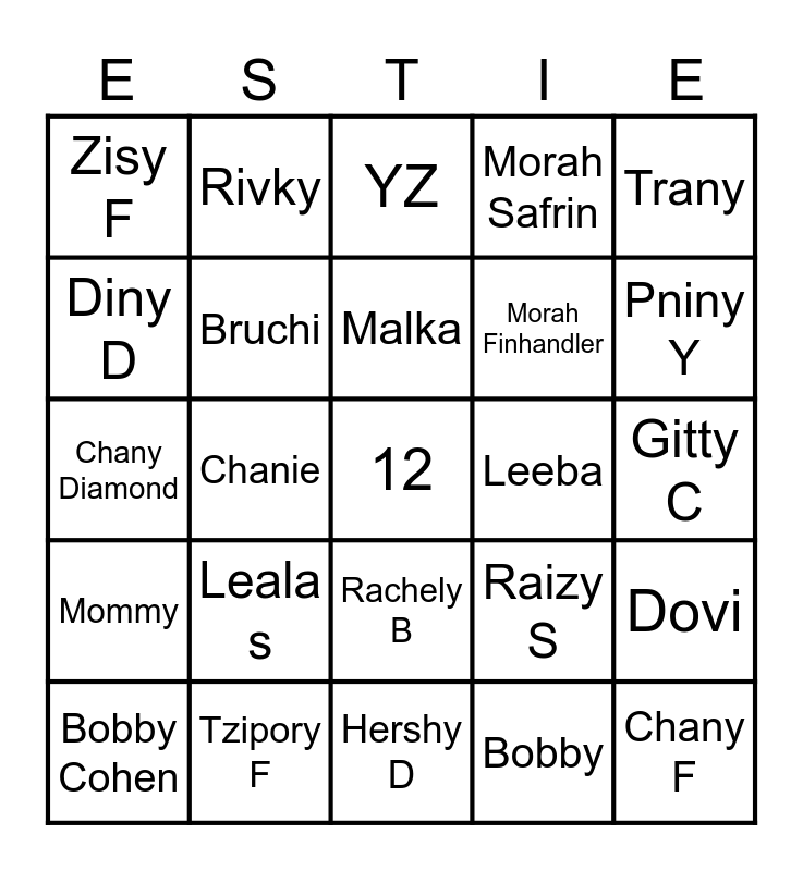 This bingo card has a free space and 32 words: Bobby, Zaidy, Chanie, Tatty, Mommy, Bruchi, Trany, Dovi, Rivky, Avigayil, Malka, YZ, Atara, Sara, Leeba, Bobby Tsatskis, Bobby Cohen, Chany Diamond, Rachely B, Leala s, Raizy S, Henny F, Gitty C, Tzipory F, Chany F, Morah Safrin, Morah Finhandler, Diny D, Zisy F, Hershy D, Dvory F and Pniny Y.