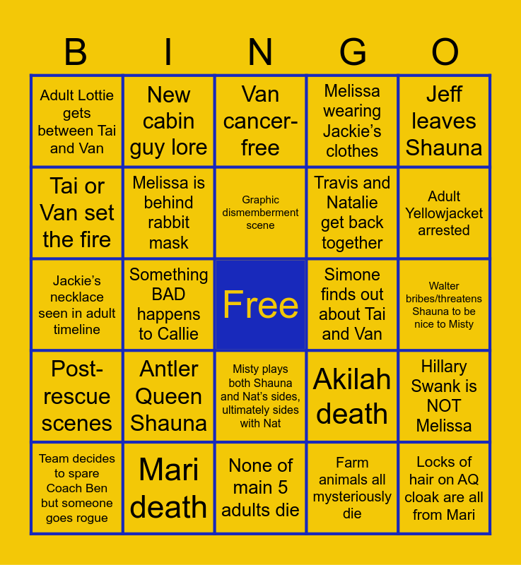 This bingo card has a free space and 24 words: Antler Queen Shauna, Mari death, Graphic dismemberment scene, Team decides to spare Coach Ben but someone goes rogue, Jeff leaves Shauna, Adult Lottie gets between Tai and Van, Tai or Van set the fire, New cabin guy lore, Simone finds out about Tai and Van, Misty plays both Shauna and Nat’s sides, ultimately sides with Nat, Travis and Natalie get back together, Jackie’s necklace seen in adult timeline, Akilah death, Hillary Swank is NOT Melissa, Melissa is behind rabbit mask, Farm animals all mysteriously die, Walter bribes/threatens Shauna to be nice to Misty, Van cancer-free, Adult Yellowjacket arrested, Something BAD happens to Callie, Locks of hair on AQ cloak are all from Mari, Post-rescue scenes, Melissa wearing Jackie’s clothes and None of main 5 adults die.