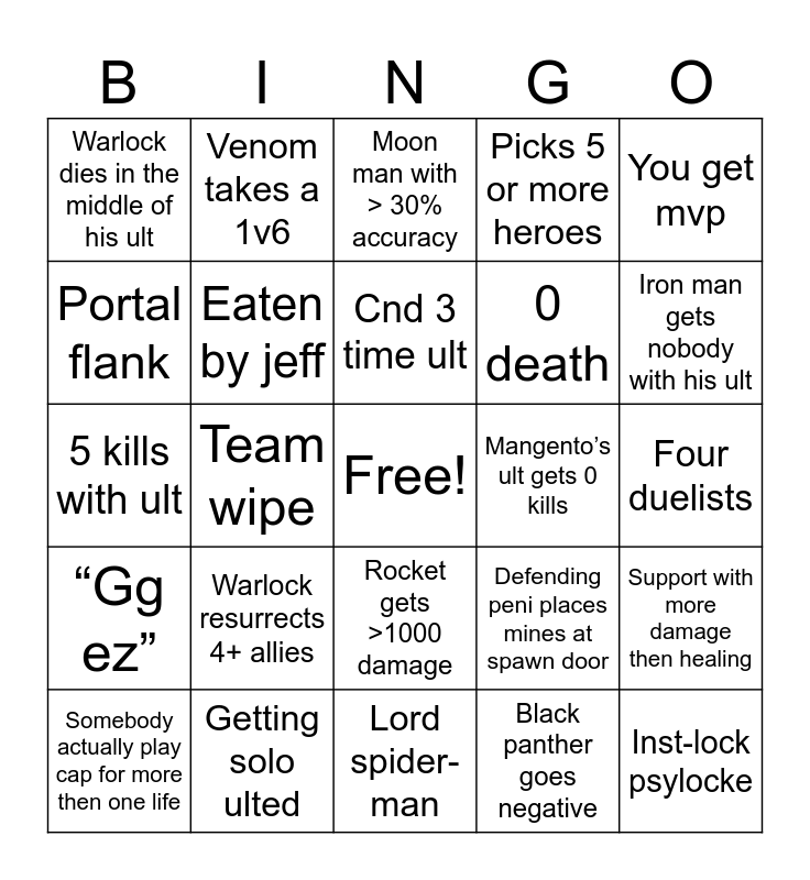 This bingo card has a free space and 31 words: Lord spider-man, Solo healer, Team wipe, AGAIN!, Warlock dies in the middle of his ult, Moon man with > 30% accuracy, Eaten by jeff, Defending peni places mines at spawn door, Mangento’s ult gets 0 kills, Black panther goes negative, Four duelists, Inst-lock psylocke, Jumped by lron fist, Wanda dies mid-ult, Iron man gets nobody with his ult, Get knocked off map, Support with more damage then healing, Warlock resurrects 4+ allies, “Gg ez”, Rocket gets >1000 damage, You get mvp, Mister fantastic dies during his ult, Somebody actually play cap for more then one life, Venom takes a 1v6, 0 death, Portal flank, Picks 5 or more heroes, 5 kills with ult, Getting solo ulted, Cnd 3 time ult and Bad tp.