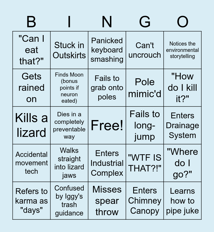This bingo card has a free space and 24 words: Walks straight into lizard jaws, Confused by Iggy's trash guidance, Fails to grab onto poles, Refers to karma as "days", Notices the environmental storytelling, "Can I eat that?", Gets rained on, Stuck in Outskirts, Fails to long-jump, Enters Industrial Complex, Pole mimic'd, Kills a lizard, "WTF IS THAT?!", "Where do I go?", Finds Moon (bonus points if neuron eated), Enters Chimney Canopy, Enters Drainage System, Panicked keyboard smashing, "How do I kill it?", Dies in a completely preventable way, Learns how to pipe juke, Accidental movement tech, Can't uncrouch and Misses spear throw.