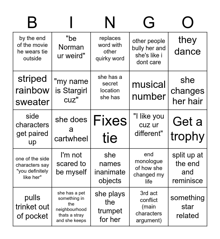 This bingo card has a free space and 24 words: pulls trinket out of pocket, I'm not scared to be myself, she has a secret location she has, 3rd act conflict (main characters argument), they dance, by the end of the movie he wears tie outside, "be Norman ur weird", replaces word with other quirky word, "I like you cuz ur different", Get a trophy, side characters get paired up, "my name is Stargirl cuz", end monologue of how she changed my life, split up at the end and reminisce, striped rainbow sweater, she has a pet something in the neighbourhood thats a stray and she keeps, she plays the trumpet for her, other people bully her and she's like i dont care, she changes her hair, one of the side characters say "you definitely like her", she does a cartwheel, she names inanimate objects, musical number and something star related.