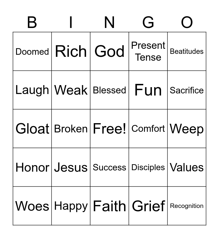 This bingo card has a free space and 24 words: Jesus, Happy, Blessed, Woes, Beatitudes, Doomed, Laugh, Rich, Comfort, Success, Fun, Gloat, Disciples, Values, Weak, Grief, Weep, God, Sacrifice, Broken, Recognition, Honor, Present Tense and Faith.