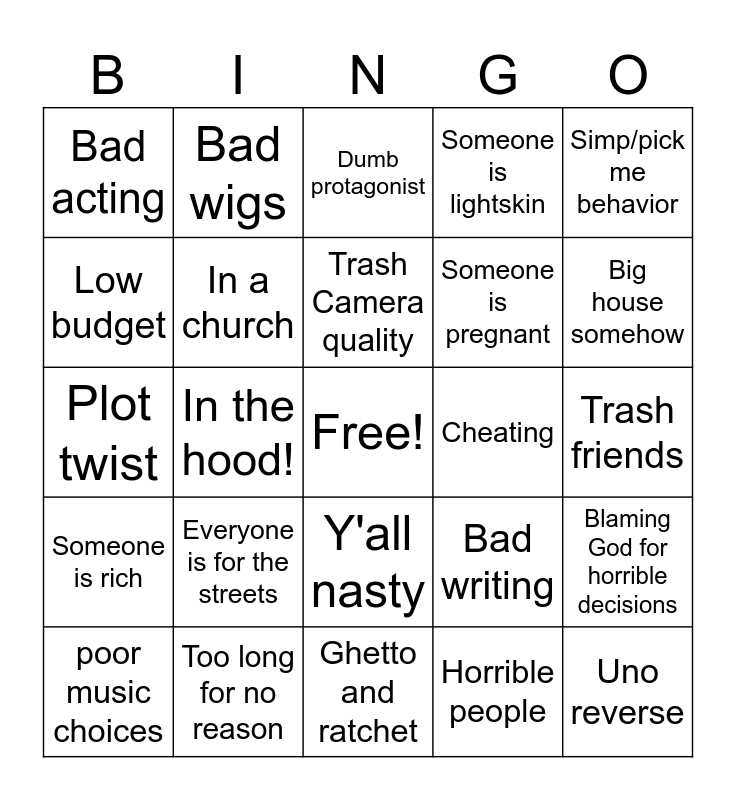 This bingo card has a free space and 24 words: poor music choices, Everyone is for the streets, Trash Camera quality, Horrible people, Simp/pick me behavior, Bad acting, Bad wigs, Dumb protagonist, Cheating, Trash friends, Plot twist, In a church, Bad writing, Blaming God for horrible decisions, Low budget, Too long for no reason, Ghetto and ratchet, Someone is lightskin, Big house somehow, Someone is rich, In the hood!, Y'all nasty, Someone is pregnant and Uno reverse.