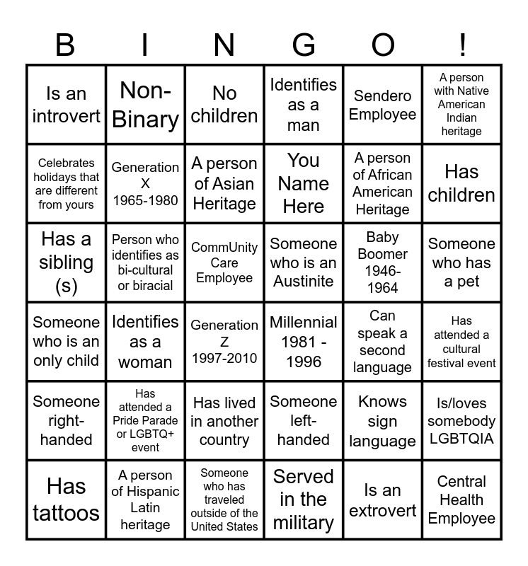 This bingo card has 36 words: Someone left- handed, Has lived in another country, Served in the military, Celebrates holidays that are different from yours, Someone who is an only child, Someone who is an Austinite, Generation X 1965-1980, Someone who has traveled outside of the United States, Sendero Employee, Knows sign language, Has children, Identifies as a man, Is/loves somebody LGBTQIA, Person who identifies as bi-cultural or biracial, You Name Here, Is an introvert, Someone right-handed, Baby Boomer 1946-1964, Has a sibling (s), No children, CommUnity Care Employee, Identifies as a woman, Millennial 1981 - 1996, Generation Z 1997-2010, Can speak a second language, Non-Binary, A person of African American Heritage, A person of Hispanic Latin heritage, A person of Asian Heritage, A person with Native American Indian heritage, Central Health Employee, Has tattoos, Has attended a cultural festival event, Someone who has a pet, Has attended a Pride Parade or LGBTQ+ event and Is an extrovert.