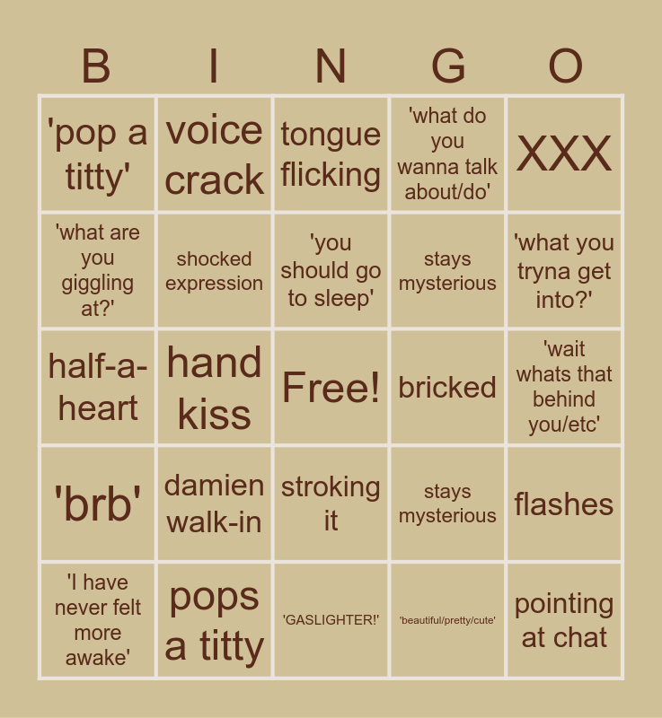 This bingo card has a free space and 24 words: damien walk-in, pops a titty, 'you should go to sleep', 'I have never felt more awake', XXX, 'pop a titty', 'what are you giggling at?', voice crack, bricked, stroking it, stays mysterious, half-a-heart, stays mysterious, flashes, shocked expression, 'beautiful/pretty/cute', 'wait whats that behind you/etc', tongue flicking, 'what you tryna get into?', hand kiss, pointing at chat, 'brb', 'what do you wanna talk about/do' and 'GASLIGHTER!'.