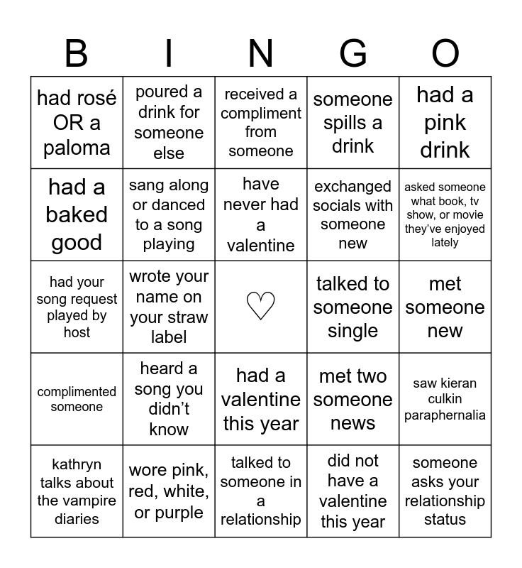 This bingo card has a free space and 26 words: had a valentine this year, did not have a valentine this year, have never had a valentine, wore pink, red, white, or purple, had a pink drink, had rosé OR a paloma, had a baked good, poured a drink for someone else, met someone new, met two someone news, exchanged socials with someone new, had your song request played by host, saw kieran culkin paraphernalia, kathryn talks about the vampire diaries, wrote your name on your straw label, participated in or overheard a conversation about astrology, someone spills a drink, complimented someone, received a compliment from someone, someone asks your relationship status, asked someone what book, tv show, or movie they’ve enjoyed lately, talked to someone in a relationship, talked to someone single, heard a song you didn’t know, sang along or danced to a song playing and got socks, a pen, or a box of sweethearts.