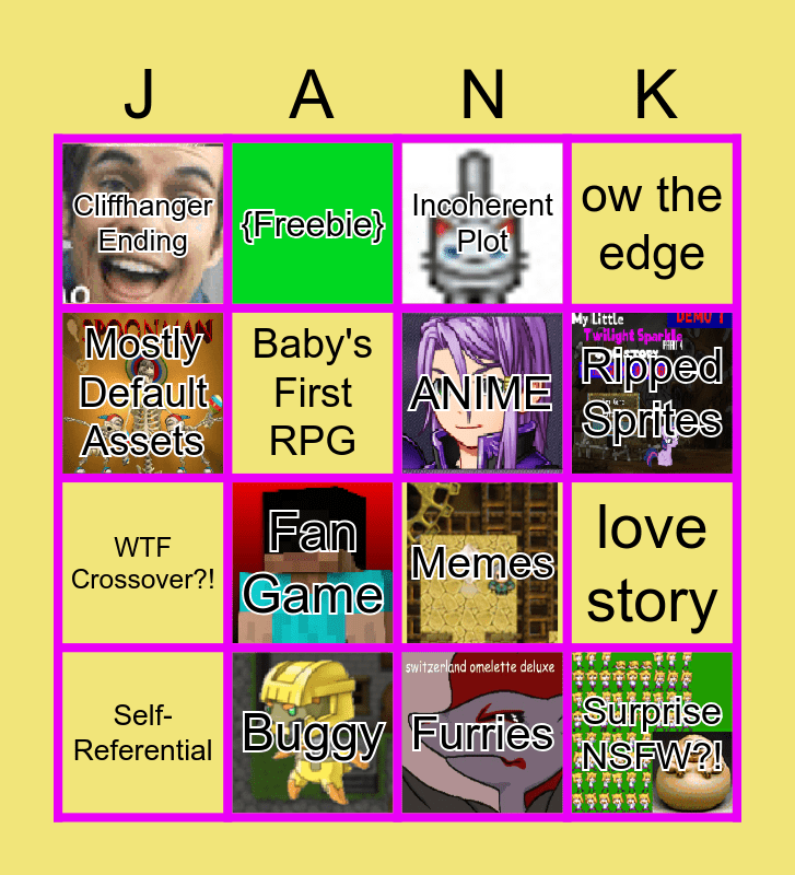 This bingo card has 24 images and 34 words: Amnesia Plot, Perpetual Demo, Softlocks, "Ok... what now?", Surprise NSFW?!, ANIME, Mostly Default Assets, Conflicting Art Styles, {Freebie}, Ripped Music, Ripped Sprites, Incoherent Plot, Game Crashes, "That 9-5 Grind", Buggy, Fan Game, Poorly Designed Maps, Memes, Graphical Bugs, Bad Grammer/Poor Translation, Extreme Difficulty for no reason, Mary Sue, Cliffhanger Ending, Furries, Earthbound Inspired, Self-Referential, ow the edge, "The Shallow End", WTF Crossover?!, Baby's First RPG, Spoopy, love story, Lore of the Rings and Game Jam Game.
