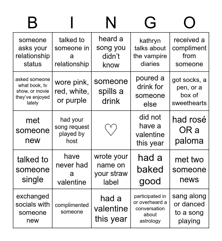 This bingo card has a free space and 26 words: wrote your name on your straw label, participated in or overheard a conversation about astrology, someone spills a drink, complimented someone, received a compliment from someone, someone asks your relationship status, asked someone what book, tv show, or movie they’ve enjoyed lately, talked to someone in a relationship, had rosé OR a paloma, had a baked good, poured a drink for someone else, met someone new, met two someone news, exchanged socials with someone new, had your song request played by host, saw kieran culkin paraphernalia, kathryn talks about the vampire diaries, talked to someone single, heard a song you didn’t know, sang along or danced to a song playing, got socks, a pen, or a box of sweethearts, had a valentine this year, did not have a valentine this year, have never had a valentine, wore pink, red, white, or purple and had a pink drink.