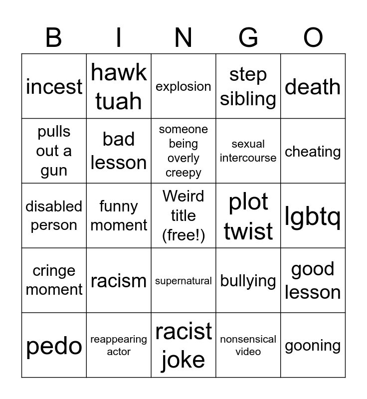 This bingo card has a free space and 24 words: racism, reappearing actor, someone being overly creepy, pedo, death, incest, pulls out a gun, hawk tuah, plot twist, supernatural, sexual intercourse, disabled person, bullying, good lesson, bad lesson, nonsensical video, lgbtq, explosion, cheating, funny moment, gooning, cringe moment, step sibling and racist joke.
