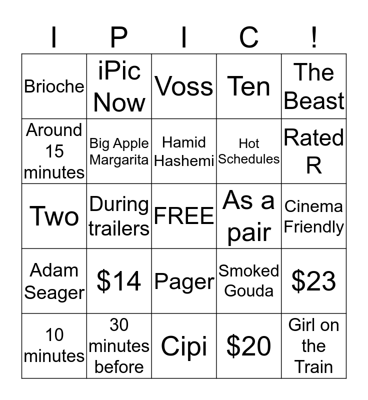 This bingo card has a free space and 24 words: $14, 30 minutes before, Hamid Hashemi, 10 minutes, The Beast, Brioche, Around 15 minutes, iPic Now, As a pair, Pager, Hot Schedules, Two, Smoked Gouda, $23, Big Apple Margarita, $20, Cinema Friendly, Voss, Rated R, During trailers, Girl on the Train, Adam Seager, Ten and Cipi.