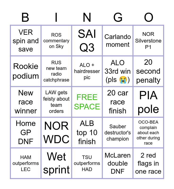 This bingo card has a free space and 24 words: HAM outperforms LEC, NOR WDC, ALO + hairdresser pic, McLaren double DNF, NOR Silverstone P1, VER spin and save, ROS commentary on Sky, SAI Q3, 20 car race finish, PIA pole, New race winner, RUS new team radio catchphrase, Sauber destructor's champion, OCO-BEA complain about each other during race, Rookie podium, Wet sprint, TSU outperforms HAD, Carlando moment, 20 second penalty, Home GP DNF, LAW gets feisty about team orders, ALB top 10 finish, ALO 33rd win (pls 😭) and 2 red flags in one race.