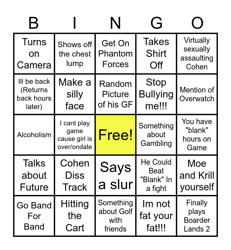 This bingo card has a free space and 24 words: Go Band For Band, Cohen Diss Track, Random Picture of his GF, Im not fat your fat!!!, Virtually sexually assaulting Cohen, Turns on Camera, Shows off the chest lump, Get On Phantom Forces, Something about Gambling, You have "blank" hours on Game, Alcoholism, Make a silly face, He Could Beat "Blank" In a fight, Moe and Krill yourself, Ill be back (Returns back hours later), Hitting the Cart, Something about Golf with friends, Takes Shirt Off, Mention of Overwatch, Talks about Future, I cant play game cause girl is over/ondate, Says a slur, Stop Bullying me!!! and Finally plays Boarder Lands 2.