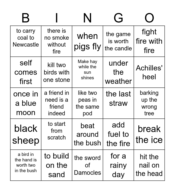 This bingo card has 25 words: to start from scratch, the sword of Damocles, Make hay while the sun shines, a bird in the hand is worth two in the bush, fight fire with fire, to carry coal to Newcastle, self comes first, there is no smoke without fire, the last straw, beat around the bush, under the weather, once in a blue moon, add fuel to the fire, break the ice, kill two birds with one stone, hit the nail on the head, barking up the wrong tree, when pigs fly, Achilles' heel, a friend in need is a friend indeed, like two peas in the same pod, to build on the sand, black sheep, the game is worth the candle and for a rainy day.