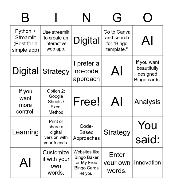 This bingo card has a free space and 99 words: AI, DATA, Innovation, Digital, Health, ChatGPT, You said:, Hi chat, I want to create bingo game with my own words that I could play with my friends, can you suggest me how and with which tools can i bulid it quickly?, ChatGPT said:, That sounds like a fun project! Here are a few quick ways to create a custom Bingo game with your own words:, No-Code / Low-Code Approaches, Canva or Excel/Google Sheets – You can manually create Bingo cards by placing your words in a grid and printing them out., Bingo Card Generators – Websites like bingobaker.com or myfreebingocards.com let you input custom words and generate cards for online or print play., Code-Based Approaches, If you want more control or automation:, Python + Streamlit (Best for a simple app), Use streamlit to create an interactive web app., Use random.sample() to shuffle words for different Bingo cards., Use pandas for tracking game progress., React + JavaScript (Best for a web app), Use React to build an interactive UI., Use a state management library like useState to track game progress., Google Apps Script (For Google Sheets automation), You can create a script to randomly generate Bingo cards in Google Sheets., Would you like a Python-based starter template, or do you prefer a no-code approach?, You said:, I prefer a no-code approach, ChatGPT said:, Great! Here’s a quick and easy way to set up your custom Bingo game without coding:, Option 1: Use an Online Bingo Generator, Websites like Bingo Baker or My Free Bingo Cards let you:, Enter your own words., Automatically generate multiple Bingo cards., Play online or print them out., Option 2: Google Sheets / Excel Method, If you want more control:, Open Google Sheets or Excel., Create a 5x5 grid and enter your custom words randomly., Copy the sheet multiple times to generate different Bingo cards., Print or share a digital version with your friends., Option 3: Canva (For a Visual Touch), If you want beautifully designed Bingo cards:, Go to Canva and search for "Bingo template.", Customize it with your own words., Download and print/share., Would you like help setting up a word list or designing the cards?, You said:, Please help me generate 24 random words and put AI every 3 words, 2/2, ChatGPT said:, Here’s a list of 24 random words with "AI" placed every 3 words:, Innovation, Strategy, AI, Future, Data, AI, Insight, Technology, AI, Growth, Impact, AI, Vision, Analysis, AI, Automation, Intelligence, AI, Learning, Neural, AI, Digital, Evolution, AI, Innovation, Strategy, AI, Future, Data, AI, Insight, Technology, AI, Growth, Impact, AI, Vision, Analysis, AI, Automation, Intelligence, AI, Learning, Neural, AI, Digital, Evolution and AI.