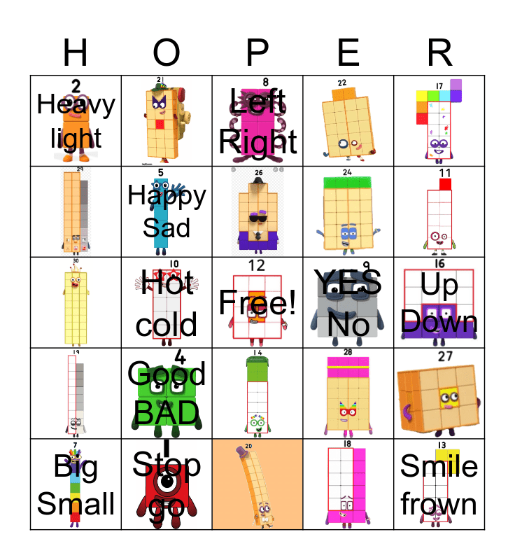 This bingo card has 29 images, a free space and 12 words: Big Small, Short & High, Hot cold, Weak strong, Heavy light, Left Right, Happy Sad, Good BAD, YES No, Stop go, Up Down and Smile frown.