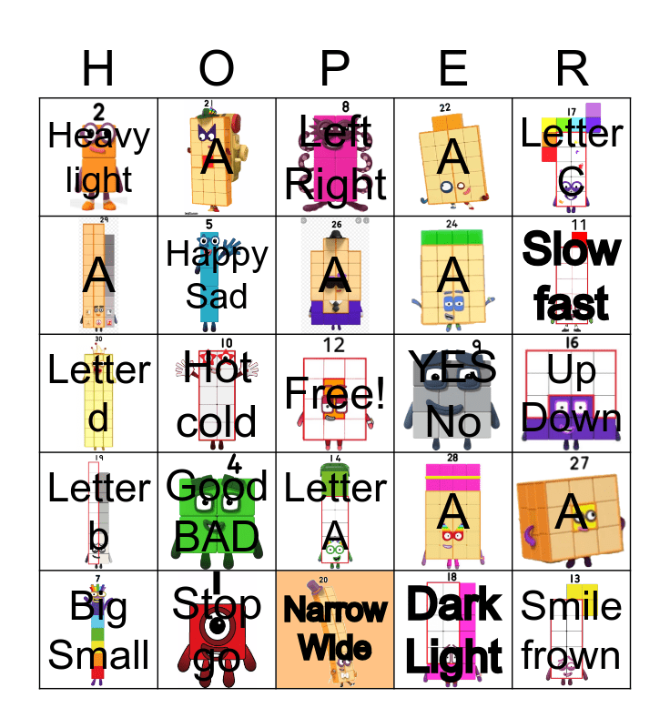 This bingo card has 29 images, a free space and 29 words: Big Small, Short & High, Hot cold, Weak strong, Heavy light, Left Right, Happy Sad, Good BAD, YES No, Stop go, Up Down, Smile frown, Narrow Wide, Dark Light, Slow fast, Fur Least, Letter A, Letter b, Letter C, Letter d, A, A, A, A, A, A, A, A and A.