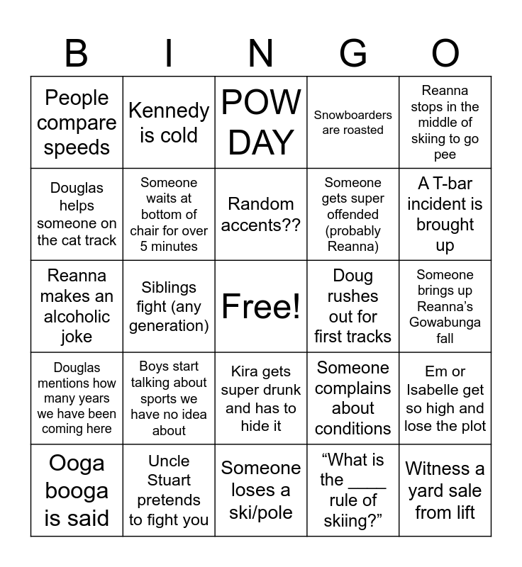 This bingo card has a free space and 24 words: Boys start talking about sports we have no idea about, Uncle Stuart pretends to fight you, Random accents??, Ooga booga is said, Reanna stops in the middle of skiing to go pee, People compare speeds, Douglas helps someone on the cat track, Kennedy is cold, Doug rushes out for first tracks, Kira gets super drunk and has to hide it, Someone gets super offended (probably Reanna), Reanna makes an alcoholic joke, Someone complains about conditions, Em or Isabelle get so high and lose the plot, Someone waits at bottom of chair for over 5 minutes, “What is the ____ rule of skiing?”, Someone brings up Reanna’s Gowabunga fall, POW DAY, A T-bar incident is brought up, Siblings fight (any generation), Witness a yard sale from lift, Douglas mentions how many years we have been coming here, Snowboarders are roasted and Someone loses a ski/pole.