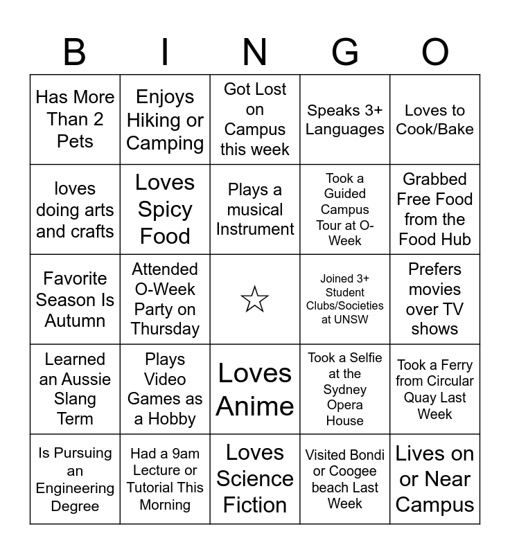 This bingo card has a free space and 35 words: Has Been to Other Australian Cities, Prefers Tea Over Coffee, Is a morning person, Loves Spicy Food, Loves Anime, Speaks 3+ Languages, loves doing arts and crafts, Just Landed in Australia Last Week, Plays a musical Instrument, Has Run a Marathon, Favorite Season Is Autumn, Loves to Cook/Bake, Is Left-Handed, Has a Birthday in April, Has More Than 2 Pets, Joined 3+ Student Clubs/Societies at UNSW, Visited Bondi or Coogee beach Last Week, Attended O-Week Party on Thursday, Learned an Aussie Slang Term, Lives on or Near Campus, Took a Selfie at the Sydney Opera House, Is Pursuing an Engineering Degree, Took a Ferry from Circular Quay Last Week, Had a 9am Lecture or Tutorial This Morning, Got Lost on Campus this week, Grabbed Free Food from the Food Hub, Grabbed Free Stationery from the Stationery Reuse Center, Went to the Wrong Classroom for a Lecture or Tutorial, Took a Guided Campus Tour at O-Week, Prefers movies over TV shows, Enjoys Karaoke, Loves Science Fiction, Plays Video Games as a Hobby, Enjoys Hiking or Camping and Grabbed 3+ Freebies at O-Week.
