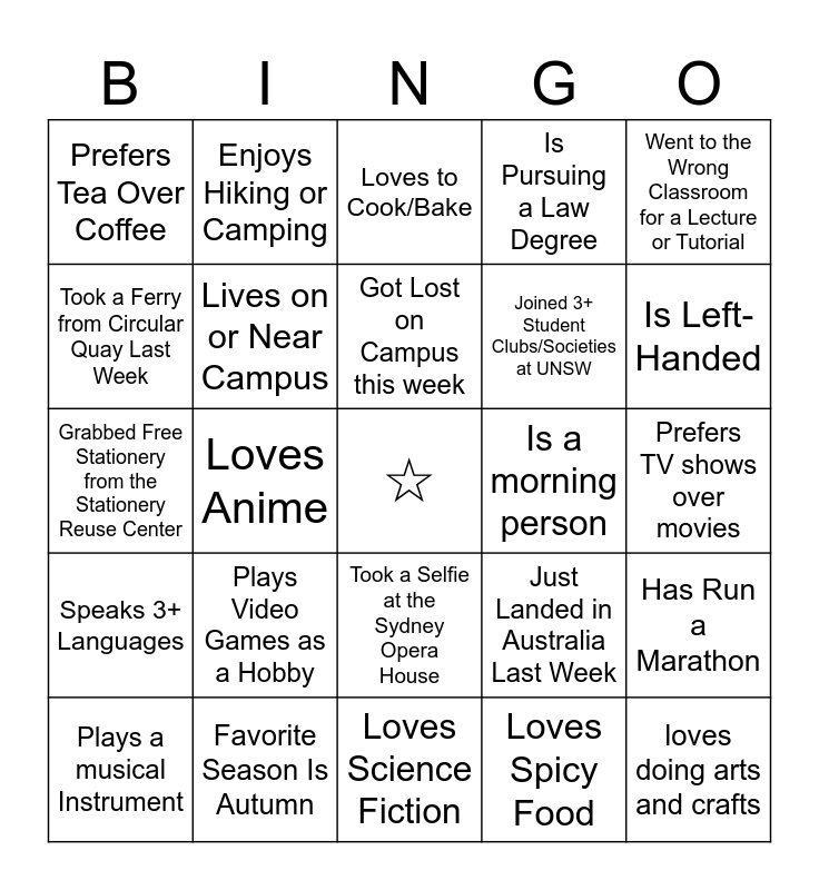 This bingo card has a free space and 35 words: Visited Bondi or Coogee beach Last Week, Attended O-Week Party on Thursday, Learned an Aussie Slang Term, Lives on or Near Campus, Took a Selfie at the Sydney Opera House, Is Pursuing a Law Degree, Took a Ferry from Circular Quay Last Week, Had a 9am Lecture or Tutorial This Morning, Got Lost on Campus this week, Grabbed Free Food from the Food Hub, Grabbed Free Stationery from the Stationery Reuse Center, Went to the Wrong Classroom for a Lecture or Tutorial, Took a Guided Campus Tour at O-Week, Has Been to Other Australian Cities, Prefers Tea Over Coffee, Is a morning person, Loves Spicy Food, Loves Anime, Speaks 3+ Languages, loves doing arts and crafts, Just Landed in Australia Last Week, Plays a musical Instrument, Has Run a Marathon, Favorite Season Is Autumn, Loves to Cook/Bake, Is Left-Handed, Has a Birthday in April, Has More Than 2 Pets, Joined 3+ Student Clubs/Societies at UNSW, Prefers TV shows over movies, Enjoys Karaoke, Loves Science Fiction, Plays Video Games as a Hobby, Enjoys Hiking or Camping and Grabbed 3+ Freebies at O-Week.