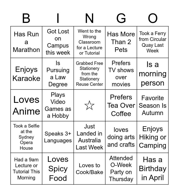 This bingo card has a free space and 34 words: Visited Bondi or Coogee beach Last Week, Attended O-Week Party on Thursday, Learned an Aussie Slang Term, Lives on or Near Campus, Took a Selfie at the Sydney Opera House, Is Pursuing a Law Degree, Took a Ferry from Circular Quay Last Week, Had a 9am Lecture or Tutorial This Morning, Got Lost on Campus this week, Grabbed Free Food from the Food Hub, Grabbed Free Stationery from the Stationery Reuse Center, Went to the Wrong Classroom for a Lecture or Tutorial, Took a Guided Campus Tour at O-Week, Has Been to Other Australian Cities, Prefers Tea Over Coffee, Is a morning person, Loves Spicy Food, Loves Anime, Speaks 3+ Languages, loves doing arts and crafts, Just Landed in Australia Last Week, Plays a musical Instrument, Has Run a Marathon, Favorite Season Is Autumn, Loves to Cook/Bake, Has a Birthday in April, Has More Than 2 Pets, Joined 3+ Student Clubs/Societies at UNSW, Prefers TV shows over movies, Enjoys Karaoke, Loves Science Fiction, Plays Video Games as a Hobby, Enjoys Hiking or Camping and Grabbed 3+ Freebies at O-Week.