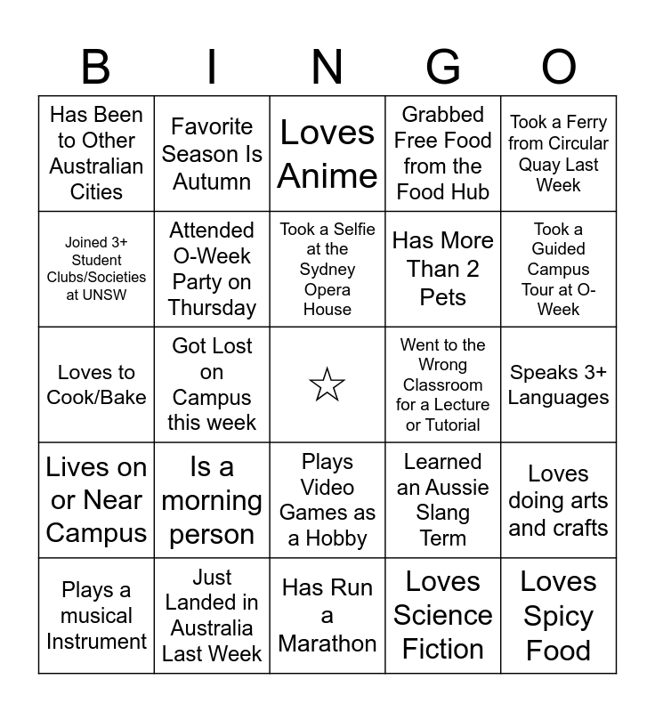 This bingo card has a free space and 36 words: Is a night owl, Wearing a UNSW T-shirt or hoodie, Visited Bondi or Coogee beach Last Week, Attended O-Week Party on Thursday, Learned an Aussie Slang Term, Lives on or Near Campus, Took a Selfie at the Sydney Opera House, Is Pursuing a Law Degree, Took a Ferry from Circular Quay Last Week, Had a 9am Lecture or Tutorial This Morning, Got Lost on Campus this week, Grabbed Free Food from the Food Hub, Grabbed Free Stationery from the Stationery Reuse Center, Went to the Wrong Classroom for a Lecture or Tutorial, Took a Guided Campus Tour at O-Week, Has Been to Other Australian Cities, Prefers Tea Over Coffee, Is a morning person, Loves Spicy Food, Loves Anime, Speaks 3+ Languages, Loves doing arts and crafts, Just Landed in Australia Last Week, Plays a musical Instrument, Has Run a Marathon, Favorite Season Is Autumn, Loves to Cook/Bake, Has a Birthday in May, Has More Than 2 Pets, Joined 3+ Student Clubs/Societies at UNSW, Prefers TV shows over movies, Enjoys Karaoke, Loves Science Fiction, Plays Video Games as a Hobby, Enjoys Hiking or Camping and Grabbed 3+ Freebies at O-Week.