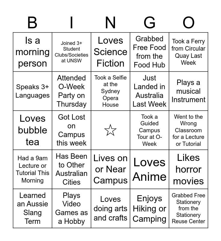 This bingo card has a free space and 39 words: Is a night owl, Wearing a UNSW T-shirt or hoodie, Visited Bondi or Coogee beach Last Week, Attended O-Week Party on Thursday, Learned an Aussie Slang Term, Lives on or Near Campus, Took a Selfie at the Sydney Opera House, Is Pursuing a Law Degree, Took a Ferry from Circular Quay Last Week, Had a 9am Lecture or Tutorial This Morning, Got Lost on Campus this week, Grabbed Free Food from the Food Hub, Grabbed Free Stationery from the Stationery Reuse Center, Went to the Wrong Classroom for a Lecture or Tutorial, Took a Guided Campus Tour at O-Week, Has Been to Other Australian Cities, Prefers Tea Over Coffee, Is a morning person, Loves Spicy Food, Loves Anime, Speaks 3+ Languages, Loves doing arts and crafts, Just Landed in Australia Last Week, Plays a musical Instrument, Has Run a Marathon, Favorite Season Is Winter, Loves to Cook/Bake, Has a Birthday in May, Has More Than 2 Pets, Joined 3+ Student Clubs/Societies at UNSW, Prefers TV shows over movies, Enjoys Karaoke, Loves Science Fiction, Plays Video Games as a Hobby, Enjoys Hiking or Camping, Grabbed 3+ Freebies at O-Week, Likes horror movies, Loves bubble tea and Can cook a dish from their home country.