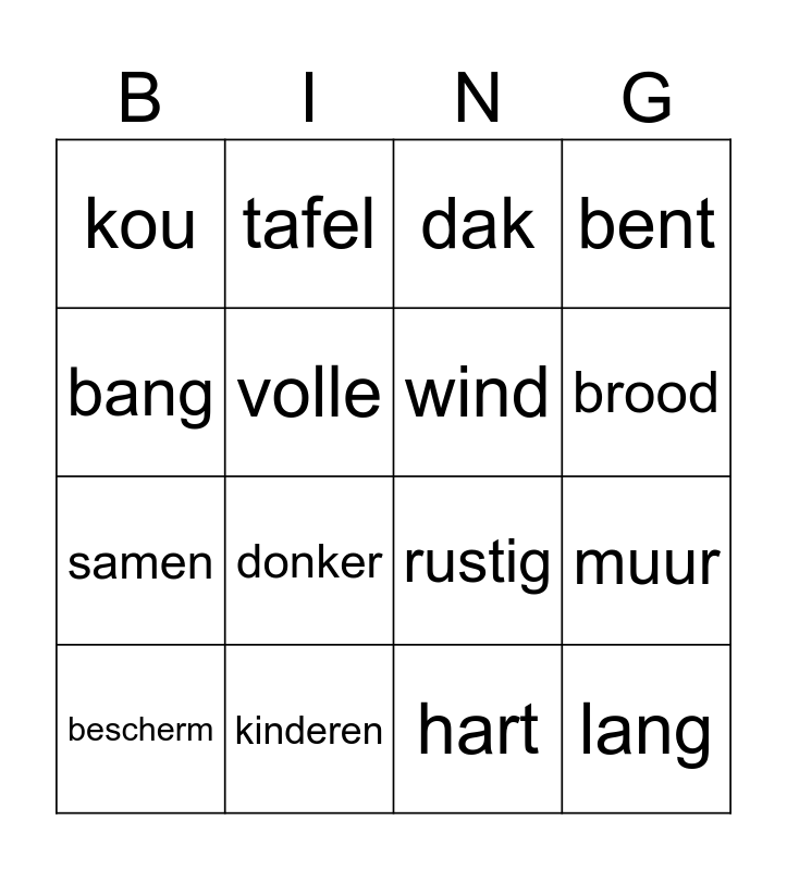 This bingo card has 16 words: kinderen, muur, dak, kou, samen, tafel, rustig, hart, bang, volle, bescherm, bent, donker, brood, wind and lang.