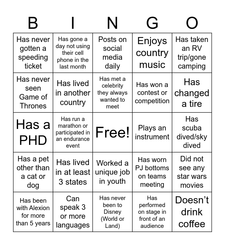 This bingo card has a free space and 28 words: Did not see any star wars movies, Has a tattoo, Has won a contest or competition, Has performed on stage in front of an audience, Has never seen Game of Thrones, Posts on social media daily, Has gone a day not using their cell phone in the last month, Has a pet other than a cat or dog, Plays an instrument, Has been with Alexion for more than 5 years, Has a PHD, Enjoys country music, Can speak 3 or more languages, Has never been to Disney (World or Land), Has changed a tire, Is not a New England Sports fan, Has lived in at least 3 states, Has lived in another country, Has met a celebrity they always wanted to meet, Worked a unique job in youth, Has never gotten a speeding ticket, Got out of a speeding/any ticket, Doesn’t drink coffee, Has run a marathon or participated in an endurance event, Has scuba dived/sky dived, Has worn PJ bottoms on teams meeting, Has taken an RV trip/gone camping and Has visited more than 4 national parks.