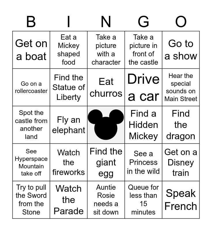 This bingo card has a free space and 24 words: Watch the fireworks, Watch the Parade, Eat churros, Try to pull the Sword from the Stone, Go to a show, Get on a boat, Go on a rollercoaster, Eat a Mickey shaped food, Find a Hidden Mickey, Find the giant egg, Drive a car, Spot the castle from another land, See a Princess in the wild, Get on a Disney train, Find the Statue of Liberty, Queue for less than 15 minutes, Find the dragon, Take a picture with a character, Hear the special sounds on Main Street, Fly an elephant, Speak French, See Hyperspace Mountain take off, Take a picture in front of the castle and Auntie Rosie needs a sit down.