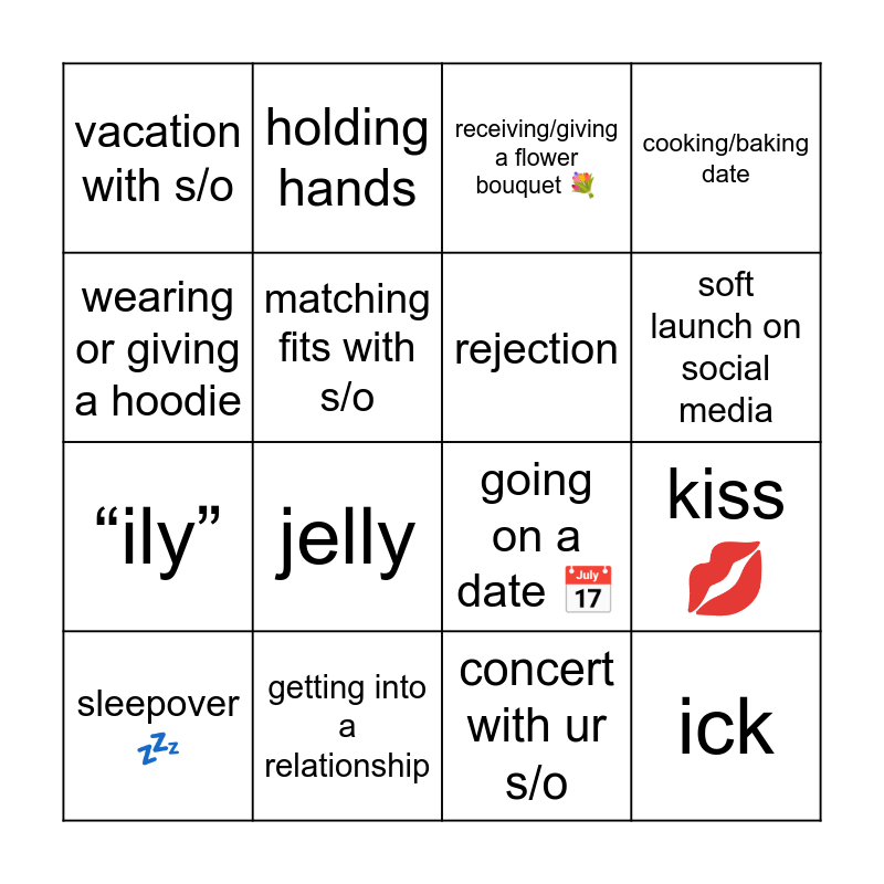 This bingo card has 16 words: getting into a relationship, kissπ, receiving/giving a flower bouquet π, vacation with s/o, βilyβ, holding hands, going on a date π , concert with ur s/o, wearing or giving a hoodie, matching fits with s/o, sleepover π€, cooking/baking date, jelly, soft launch on social media, rejection and ick.