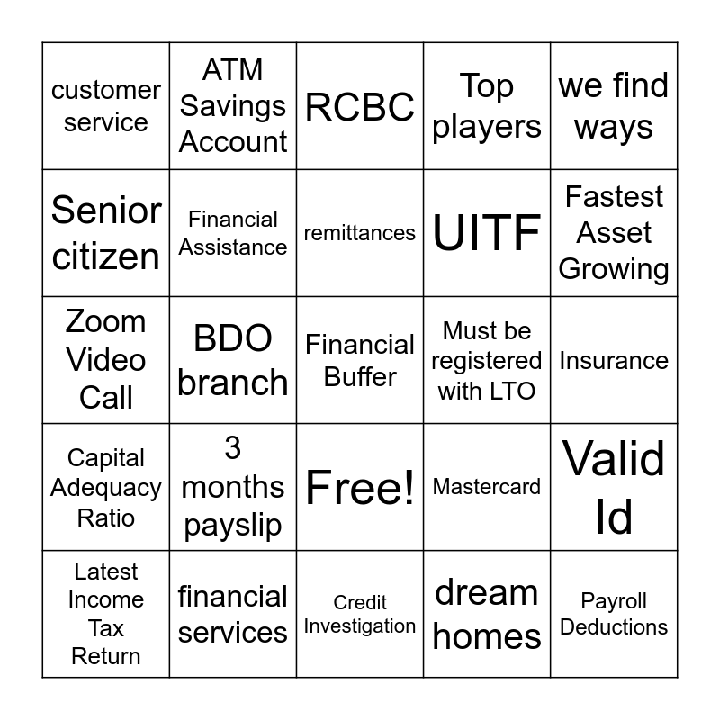 This bingo card has 26 words: Free!, dream homes, remittances, financial services, we find ways, customer service, Senior citizen, ATM Savings Account, Insurance, Mastercard, UITF, Zoom Video Call, Valid Id, Latest Income Tax Return, BDO branch, Application form, Top players, Capital Adequacy Ratio, RCBC, Financial Buffer, Fastest Asset Growing, Credit Investigation, Must be registered with LTO, 3 months payslip, Financial Assistance and Payroll Deductions.