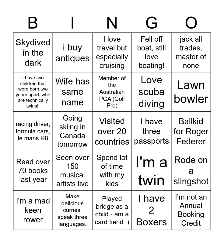 This bingo card has 159 words: Free!, Ambidextrous in sports, but selectively, Not much fun in my facts, Have 2 clownfish, Just got back from European holiday!, Bought a new house, 5 cats, 1 dog, 4 chickens, 5 cats, 1 dog, 4 chickens, 40000 bees, 2 wives (1 ex), I've been to North Korea, Food, I’m not an Annual Booking Credit, Bungee-Jumped, Wife has same name, I used to play the snare drum in my high school pipe band and wore a kilt!, I have three passports, Have crashed a helicopter, Brewmaster of backyard fermentation sorcery, My children named after Australian towns, I can't play the bagpipes., I sail, and ride horses, I learned to speak fluent French at school, Love travelling, Preparing for my first triathlon experience, Nil, Used to drum in metal band, I've been bitten by a lion, Read over 70 books last year, Seen over 150 musical artists live, Collecting & building Lego sets., I was born in West Germany., I played basketball for Australia, Played local Backgammon Damascus Railway Station, Can't swim :P, Ultra marathon runner, Went to Korea twice in 6 months!, Proud mother of 45 house plants, I can water ski, The weather is great up here., Play Guitar, Former Nightclub bouncer, I am an IT nerd, I love to travel! My aim is to get to every continent before I die!, own 4 birds :), Black belt in Karate, I have traveled around Australia!, love to cook, I actually don't mind Nickleback, Been to 24 countries, can juggle, and am a former national team rower, I've climbed Uluru, beer on top., I worked in radio, visited over 70 countries, I'm a mad keen rower, I love playing frisbee golf, Rode on a slingshot, I enjoy back country skiing, Make delicious curries, speak three languages., Produce music in my spare time, I enjoy painting and playing the guitar, I'm an Australian Wife Carrying Champion, Won a regional Poker tournament, i buy antiques, Visited over 20 countries, I'm a twin, Rescued a Groodle, Dogter Spencer Reid, State level Hockey player, Going skiing in Canada tomorrow, Was on "Who wants to be a millionaire", I have bungy jumped in NZ, My partner and I recently had a baby boy, Skydived in the dark, I paint, Lived in Japan when young, Fell off boat, still love boating!, I have been a pianist for my church for the past 25 years., I have a furbaby called Poppy, Have hit 2 hole in ones in golf, Spend lot of time with my kids, Audio Engineer, Mechanic, IT Hardware Engineer., Played in 6 GFs and lost, Been skydiving twice. No more!, I visited 20 countries, Play piano (well) and guitar (badly), My first job out of school at 17 years old was as a Santa in a shopping centre, went paraponting in Austria, I play one game of solitaire every day, na, I have a Webbed finger, Is a scientist, Co-author of a textbook, Collect/Restore Vintage Computers & arcade machines, I lived and worked in London for 5 years in my 20's, Sole Parent, Primary Producer (Farmer), Helicopter Technician, I have 2 Boxers, Known for speaking hip gen Z lingo fluently. Some (Newcastle office) might say *too* fluently., I have two children that were born two years apart, who are technically twins!!, I will be in-between a move from Brisbane to Melbourne during the event, Can speak 3 languages, I kiteboard as a hobby, I like to travel and I've recently taken up Crocheting, racing driver, formula cars, le mans R8, I HAVE 5 CHILDREN, Member of the Australian PGA (Golf Pro), Love scuba diving, Probably overthinking this fun fact, Attended 2 Football World Cup Finals, I know 3 languages, I'm a Stormtrooper from Star Wars. Seriously LOL. I belong to an international organisation called the 501st Legion and visit Children's Hospitals, raise money for charity and attend official Disney events in costume., I love wing foiling as my current sport and have a border collie and 2 kids in Auckland, Lawn bowler, I've flown small aircraft before. Last month, I went on a hot air balloon ride in the Hunter Valley, and my next goal is to try skydiving., Mountain biked silver star ski resort, Played bridge as a child - am a card fiend :), watch Seinfeld every morning, Have an extensive record collection, I played Underwater Hockey for NZ, I grew up in a country pub., I shoot, develop & print film photography 📸🎞️🏞️, made marshmallows and maltesers from scratch, Loves to fish, I have 2 Dads, 1xBiological, 1x 9yr old Boston Terrier, Ride a Suzuki Cruiser Motorbike, I once competed in a food eating competition and won!, I was a teacher., jack all trades, master of none, Golf, F1, Horses, Pub, Beer, Repeat, I'm a tragic Knights supporter!, Have dined with every Prime Minister since John Howard, My shoe collection is over 100+, Backpacked around the world, Avid Rock climber, Ex semi-pro basketballer, Sky dived over the coast of Ohau., Tech Tinkerer, love playing cricket, I’m a purple belt in BJJ, I do astrophotography, Chess hustler. Podcast hater. Tiramisu enjoyer., I love travel but especially cruising, Play piano and sing, Coffee enthusiast, wicked double espresso, I'm a musical comedian!, hobbyist game designer, I dress up as Star Wars, Love dogs!, Ballkid for Roger Federer, Broke every finger on right hand., I’m really a gentle giant, I have visited over 30 countries, spicy food lover, Have a dog, I'm a football coach., Can solve a Rubik’s cube, Founded the Brisbane Horror Film Society, Visited 9 countries, I like storms and rainy days, Visited 41 countries, first computer run on 360KB floppy, I make dance music for fun, I brew beer and Play guitar.