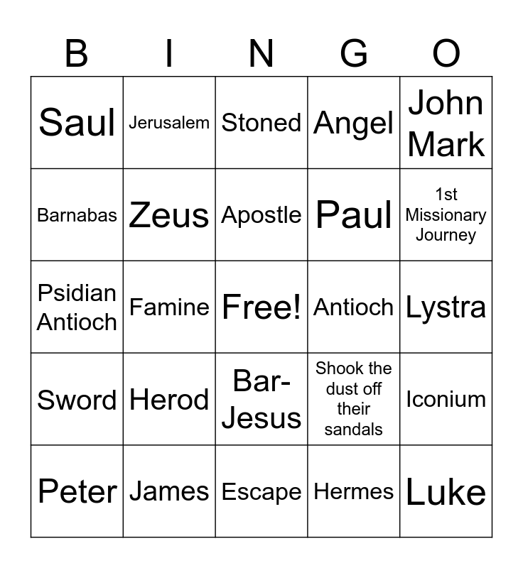 This bingo card has a free space and 24 words: Herod, James, Apostle, Peter, John Mark, Saul, Barnabas, Jerusalem, Antioch, Bar-Jesus, Paul, Psidian Antioch, Shook the dust off their sandals, Iconium, Zeus, Hermes, Lystra, Stoned, 1st Missionary Journey, Famine, Luke, Sword, Angel and Escape.