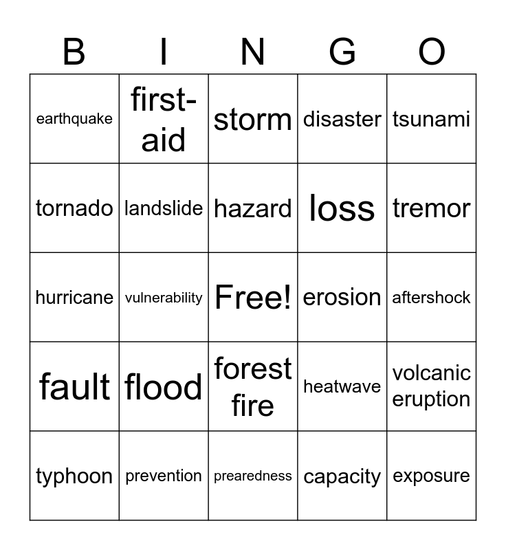 This bingo card has a free space and 24 words: typhoon, flood, hazard, capacity, tsunami, earthquake, first-aid, storm, erosion, aftershock, hurricane, landslide, heatwave, volcanic eruption, tornado, prevention, prearedness, disaster, tremor, fault, vulnerability, forest fire, loss and exposure.