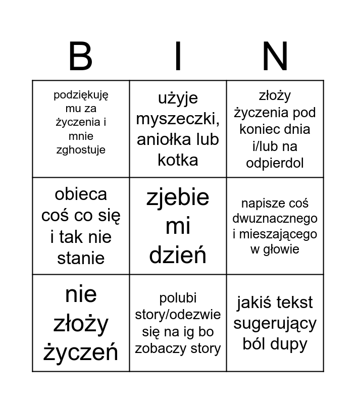 This bingo card has 9 words: nie złoży życzeń, złoży życzenia pod koniec dnia i/lub na odpierdol, użyje myszeczki, aniołka lub kotka, obieca coś co się i tak nie stanie, podziękuję mu za życzenia i mnie zghostuje, napisze coś dwuznacznego i mieszającego w głowie, zjebie mi dzień, jakiś tekst sugerujący ból dupy and polubi story/odezwie się na ig bo zobaczy story.