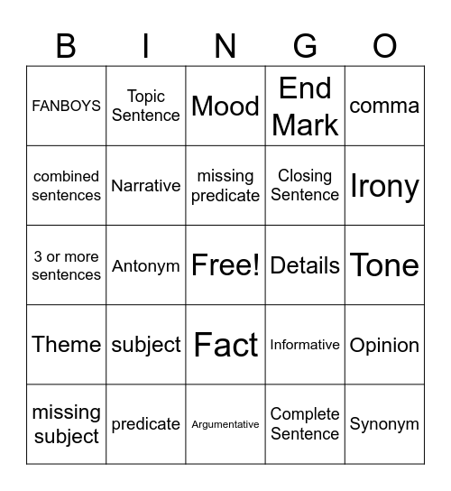 This bingo card has a free space and 24 words: subject, predicate, missing predicate, missing subject, comma, FANBOYS, combined sentences, Topic Sentence, Details, Fact, Closing Sentence, 3 or more sentences, Informative, Opinion, Narrative, Complete Sentence, Tone, Mood, Irony, Antonym, Synonym, Theme, End Mark and Argumentative.