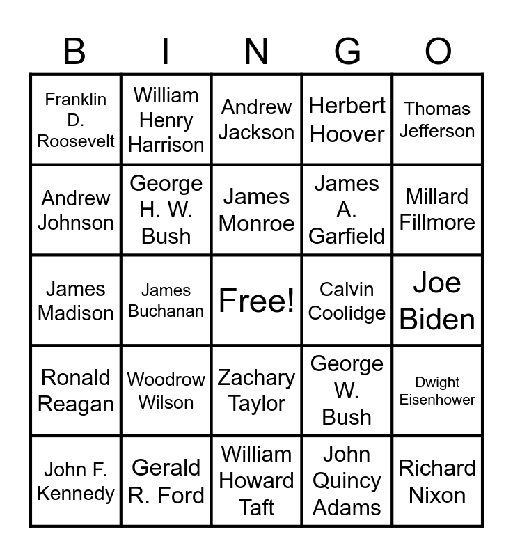 This bingo card has a free space and 44 words: George Washington, Richard Nixon, Warren G. Harding, John F. Kennedy, Abraham Lincoln, John Quincy Adams, Andrew Jackson, Theodore Roosevelt, Thomas Jefferson, Gerald R. Ford, Herbert Hoover, Calvin Coolidge, Zachary Taylor, Woodrow Wilson, Harry S Truman, William Howard Taft, James K. Polk, James Madison, Rutherford B. Hayes, Millard Fillmore, William Henry Harrison, Grover Cleveland, Chester A. Arthur, Franklin D. Roosevelt, Donald Trump, Joe Biden, Barack Obama, Bill Clinton, George W. Bush, Ronald Reagan, Lyndon B. Johnson, Dwight Eisenhower, William McKinley, Benjamin Harrison, James Buchanan, Franklin Pierce, John Tyler, Martin Van Buren, James Monroe, Andrew Johnson, James A. Garfield, Ulysses S. Grant, George H. W. Bush and Jimmy Carter.
